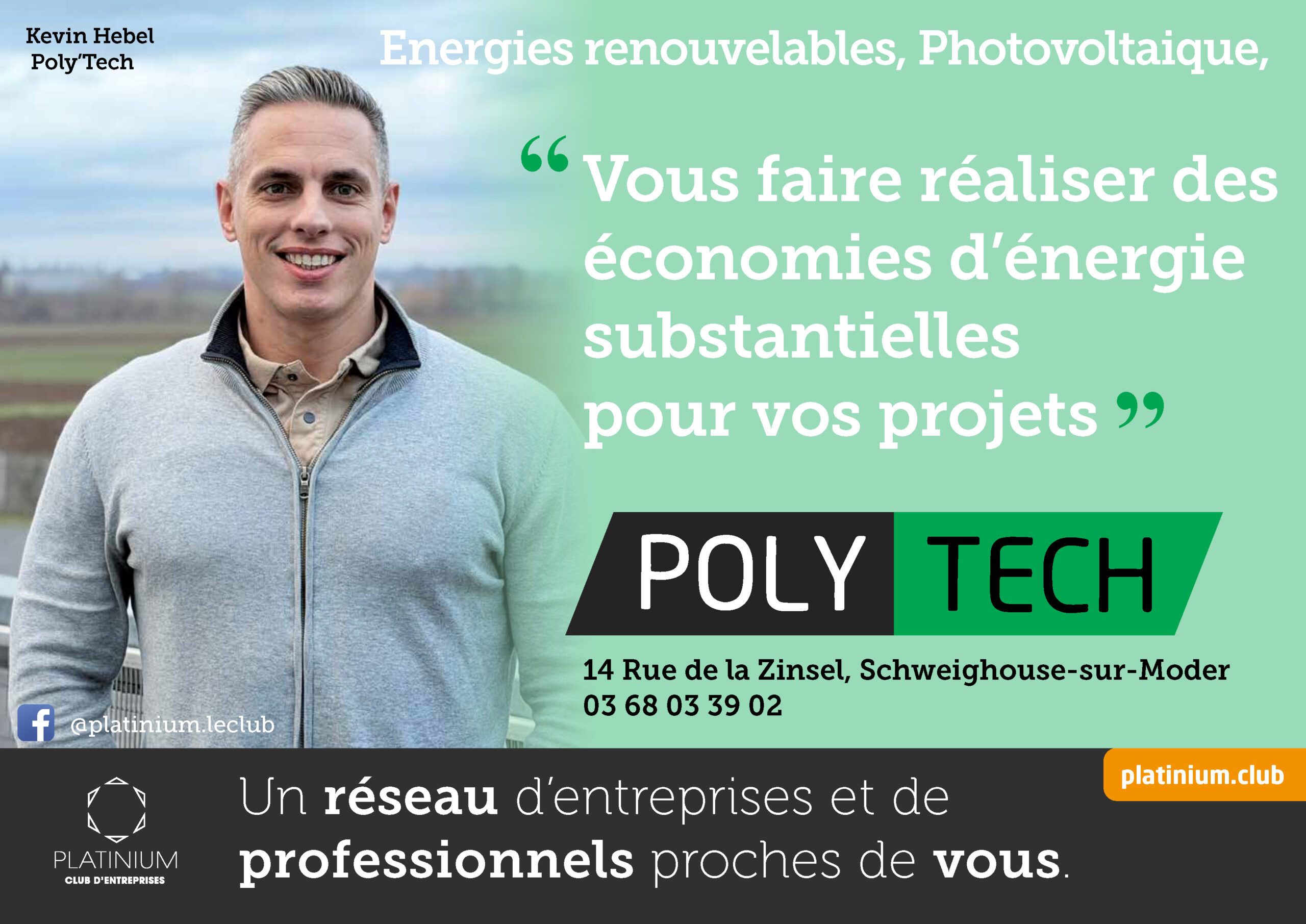 Basée à Schweighouse-sur-Moder, l'entreprise se déplace dans tout le Bas-Rhin. Notez que pour la mise en place d’une centrale solaire, Poly’Tech est plus largement mobile encore, et peut intervenir aussi bien dans le Haut-Rhin qu’en Lorraine.